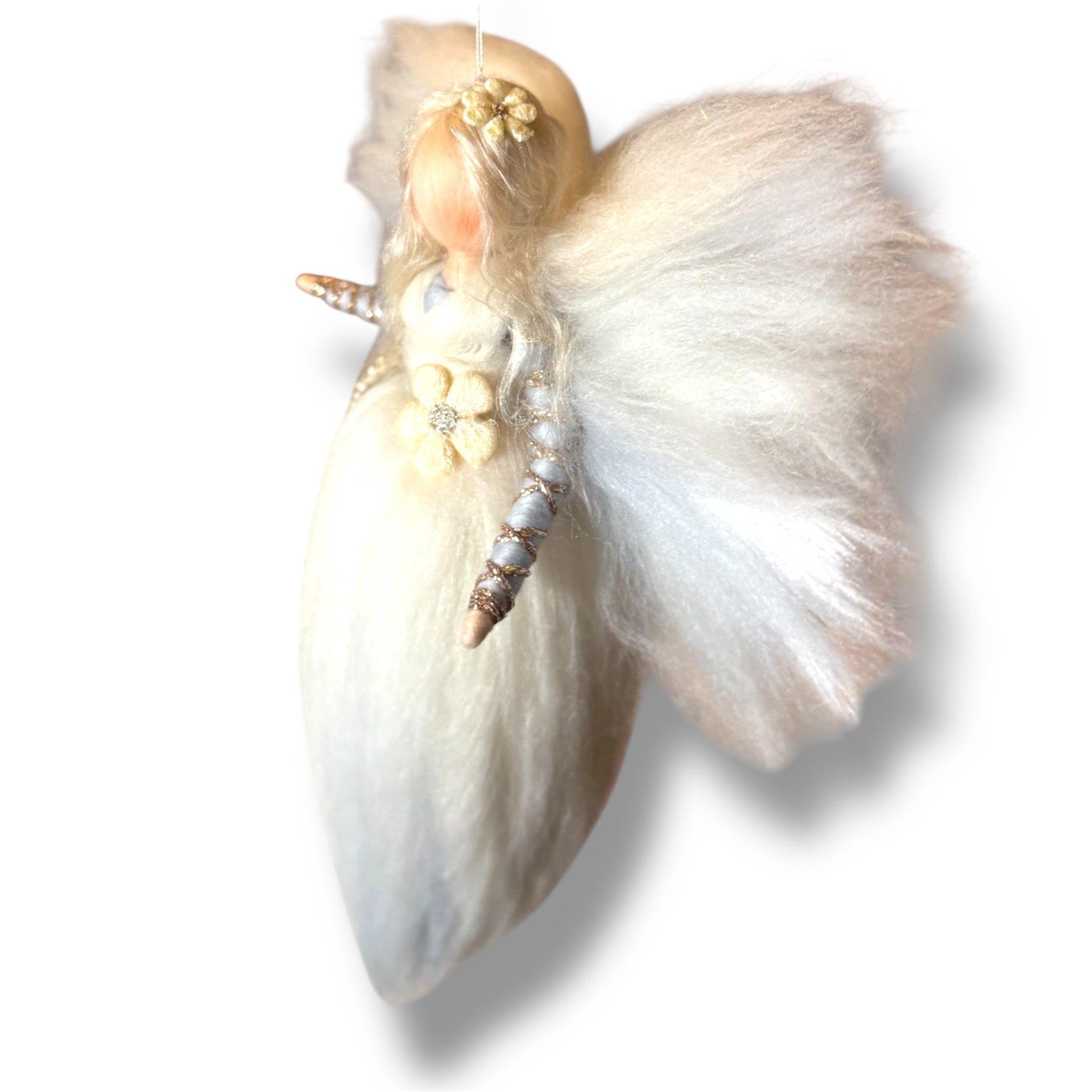 HjerteHvids smukke uldengle og feer er håndlavede med inspiration fra Waldorf-pædagogikken, og de kombinerer naturlige materialer som blød uld og fin silke for at skabe en æstetisk og harmonisk dekoration. Pynt kan være af andre materialer. Englene har en enkel og yndefuld form, som fremhæver de naturlige materialers skønhed. De er perfekte til at hænge op som pynt i børneværelset, på juletræet eller som en del af en årstidsdekoration.